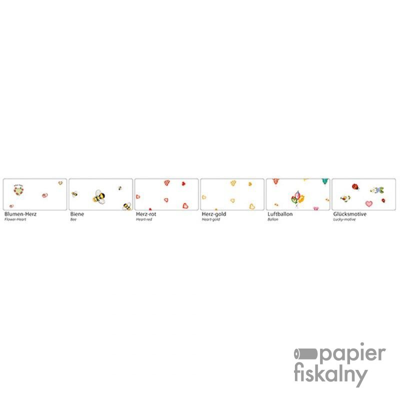 6 różnych wzorów: w kwiaty, złote serca, czerwone serca, pszczółki, balony oraz motyw szczęścia