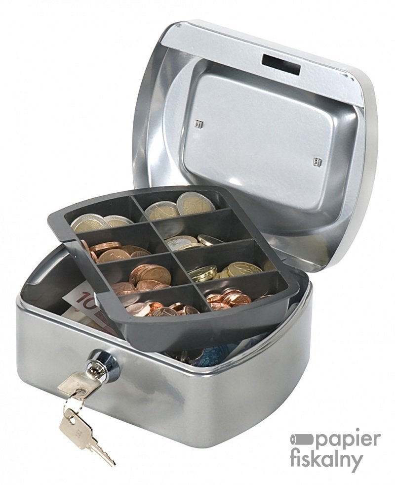 mała kasetka na pieniądze wyprodukowana z lakierowanego proszkowo metalu odpornego na zarysowania