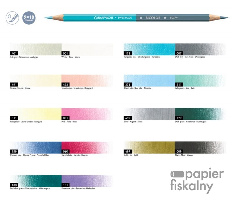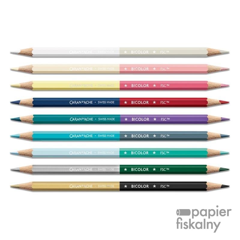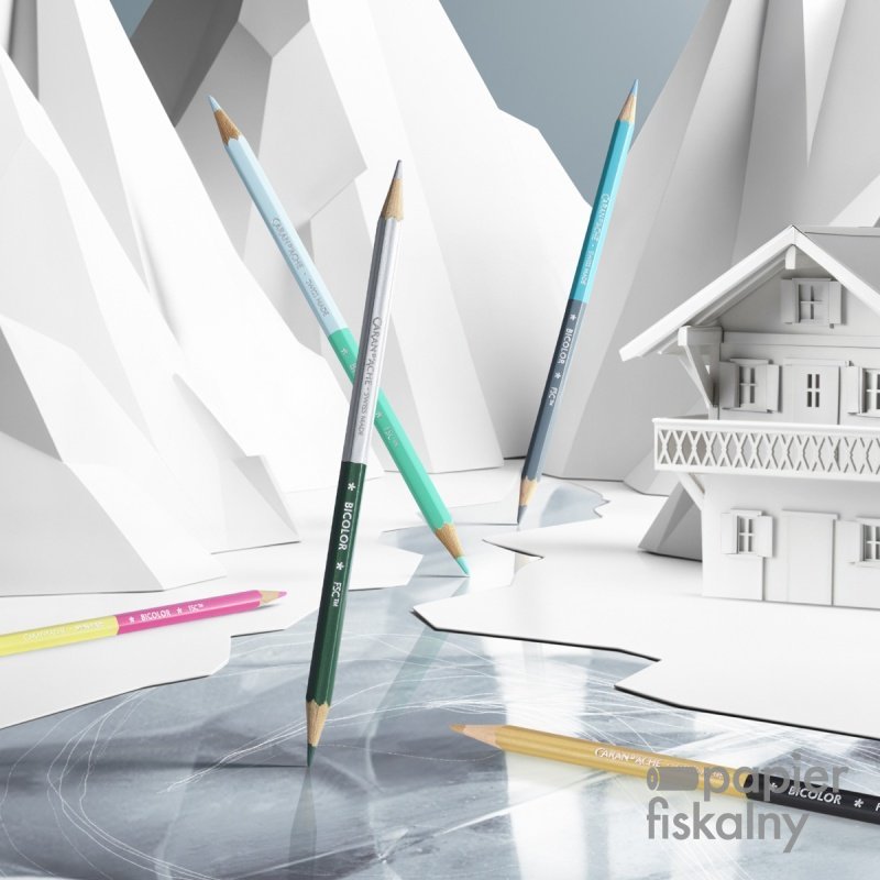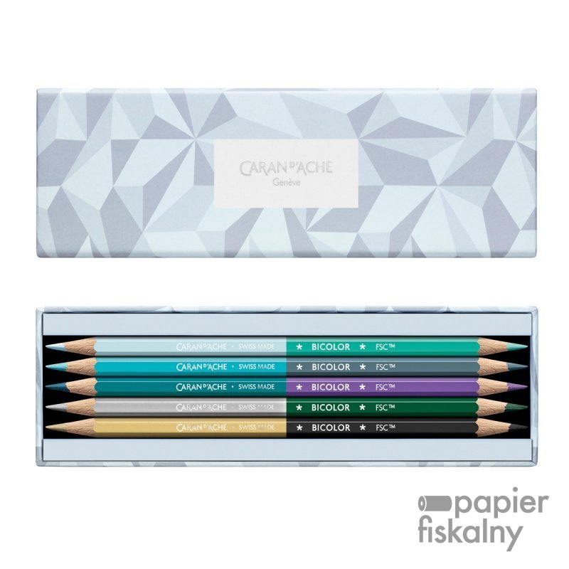 Kredki wykonane są z drewna cedrowego, z certyfikatem FSC. Kolor korpusu dopasowany do koloru grafitu Ø 2,8 mm, który jest miękki i wytrzymały. Ekskluzywny srebrny kolor Caran d’Ache + Swiss Made + Bicolor + FSC™ wytłoczony na gorąco na kredkach.